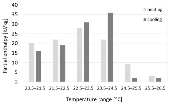 Taking these requirements into account, the phase change material was chosen first. The phase change material used in the analysis is paraffin RT24. The melting area is 21–25 °C, with a peak at 24 °C. The total phase change range for the material is from 16 to 31 °C. However, for our study the useful range is from 21 to 26 °C. The enthalpy characteristics for the specific temperature range is presented in Figure 4. The total amount of latent heat that can possibly be accumulated between 20.5 and 26.5 °C is 104 kJ/kg. The other properties are as follows: heat conductivity 0.2 W/(m2·K), and density 880 kg/m3 (solid state) and 770 kg/m3 (liquid state). The reason for choosing this phase change material was its thermal characteristics, particularly its enthalpy in the given temperature range. Paraffin RT24 is characterized by having the highest heat storage capacity in the 23.5–24.5 °C range. According to the manufacturer (Rubitherm GmbH, Berlin, Germany), the total heat storage capacity for the range of 20.5–26.5 °C is 104 kJ/kg and makes up 65% of its total value at 160 kJ/kg [36].