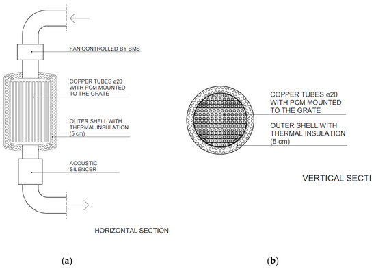 The authors proposed a novel heat gain storage system in the peripheral PCM tank, the scheme of which can be seen in Figure 5. The installation consists of an air intake, a turbine with a maximal airflow of 420 m3/h, which corresponds to 3 air changes per hour for the living area (living room and kitchen), a PCM heat storage, air ducts, an acoustic damper, and an air exhaust in the living room. The heat storage tank was designed as a cylinder built from two steel plate shells, filled with polyurethane or aerogel thermal insulation. The external diameter of the cylinder is 54 cm and the length is 80 cm. The internal envelope was fitted with steel rods and 137 of 20-mm copper tubes filled with PCM were fitted to them. To optimally use the volume of the tank, 8 additional 15-mm tubes were placed inside. The length of all tubes is 61 cm. The top and bottom of the cylinder were constructed and insulated like the sides of the cylinder. Two 160-mm stub pipes were placed in the geometrical centre of the circle. The total volume of PCM is 0.027 m3, while the maximum energy capacity of the storage tank is 848 kJ.