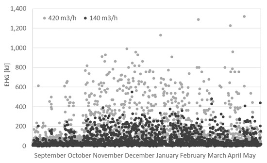 The analysis of the stored heat gain was conducted for three rooms of the building described in Section 3: the kitchen, the dining and living room. The calculations presented below were performed using real data from measurements conducted between February 2017 and February 2018. For the entire period, excess heat gain (SEHG) was defined as the sum of all temporary heat gains. According to Equation (1), TEHG is positive if the temperature increases during a single time step with respect to the previous time step and the temperature is higher than the base temperature (20 °C). The assumption is made that it is possible to accumulate excess heat gain and utilise it later. The device filled with RT24 described in Section 4 was used in the storage tank. The SEHG values achieved in the entire heating season can be seen in Figure 6, except for the intervals when they were equal to 0. The values were defined in 10-min time steps. The average TEHG value for the entire heating season was 19.3 kJ.