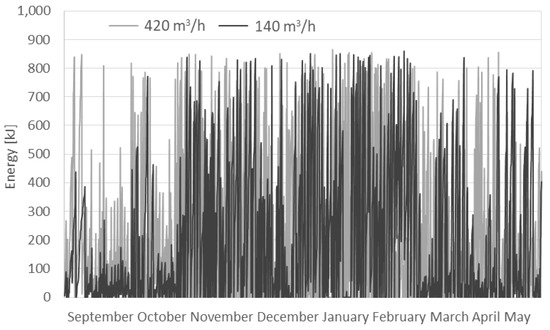 It is important to note that these values only refer to the three rooms that belong in the day zone of the building. Figure 7 shows the temporary level of charge of the PCM storage tank. Maximal values are the result of limiting the energy capacity of the storage tank, set as 848 kJ and achieved independently during the time period. As seen in Figure 7, the storage tank is effectively used throughout the entire duration of the analysis period, particularly in the winter months from December to February. The changes show that the storage tank is regularly charged and discharged, with hardly any periods when it is not in use. The period of zero values in March is due to no measurement data as a result of faulty measuring equipment. The total amount of heat stored and released into the room is dependent on the assumed airflow. The value of SEHG achieved during the heating season is 88 MJ assuming an airflow of 140 m3/h, which corresponds to air exchange only in the kitchen and the living room. Increasing the airflow to the maximal throughput of exchanger (420 m3/h), improves the stored energy potential to 208 MJ, which corresponds to an electricity reduction of 33%.