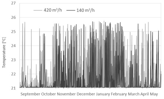 The innovative heat recovery system proposed maintains a constant air temperature in the building’s thermal zone. A description of the heat storage tank can be found in Section 4 of this article. The amount of heat stored in the tank was calculated according to the following assumptions. A 100% heat storage efficiency was assumed, along with the size of the tank, and allowing for an airflow in the room of up to 3 air changes per hour (420 m3/h). Although these values are simplified, the aim of this article was not to find the heat storage potential of the tank, but rather, the potential excess heat gain in the building. Optimising the storage tank and the means of heat exchange between the airflow and the PCM closed in tubes could be a basis for further research. Due to the character of internal air temperature changes and the volume of the storage material, the amount of stored heat was limited. The results of the storage tank’s temporary charge can be found in Section 5 of the article. Moreover, the amount of the seasonal heat gain available for storage and the reuse in the building was defined.