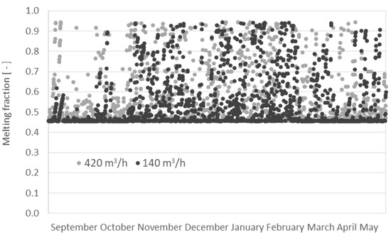 Melting fraction of the PCM in the storage tank for different airflow rates.