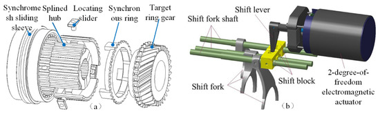 The scheme of the transmission: (a) the structure of the locking ring synchronizer; (b) two-degrees-of-freedom direct-drive electromagnetic gearshift system.