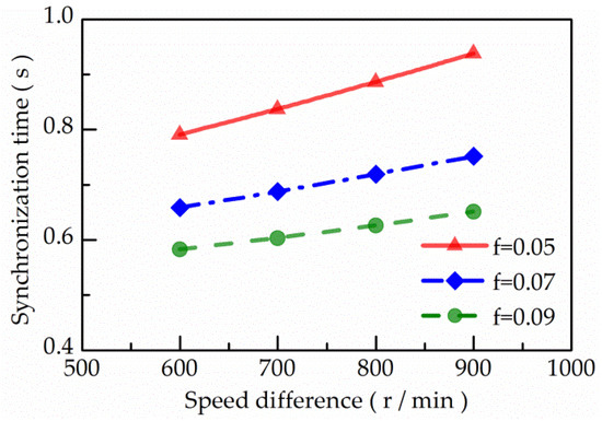 The simulation model of a synchronizer in synchronization phase was built, and the influence of friction coefficient change between the synchronizer’s friction pairs on synchronization performance was analyzed. According to the value range of the friction coefficient of the locking ring synchronizer’s friction pair selected in this paper, the friction coefficient was set to 0.05, 0.07, and 0.09 in the simulation process, and the rotational inertia of the synchronized partial was 0.04 Kg·m2. The influences of speed difference and friction coefficient on synchronization time were analyzed, as shown in Figure 2.