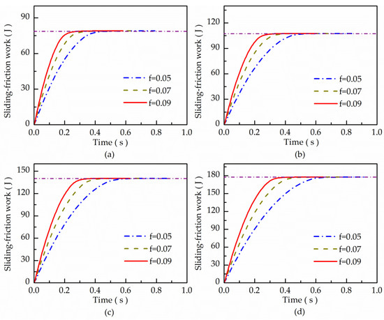 When the inertia of the synchronized part was 0.04 Kg·m2, the influence of speed difference and friction coefficient on sliding-friction work was analyzed, as shown in Figure 3. The variation trend of sliding-friction work was basically the same under different shifting speed differences and friction coefficients. When the shifting speed difference was the same, the friction coefficient had no effect on the final value of sliding-friction work, but only affected the increase rate of sliding-friction work. The greater the friction coefficient was, the shorter the time it took for the sliding-friction work to reach the final value. When the shifting speed difference was 600 r/min, the sliding-friction work consumed under the three friction coefficients was 78.96 J. However, when the friction coefficient was 0.09, the time needed to reach the final value of sliding-friction work was 0.21 s shorter than when the friction coefficient was 0.05. When the final value of sliding-friction work was determined, the shorter the synchronization time was, the more heat generated per unit of time. Moreover, excessive heat generated per unit of time may have caused damage to the friction surface.
