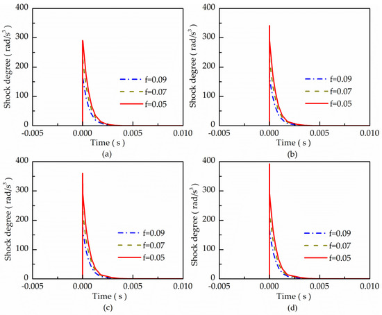 When the inertia of the synchronized part was 0.04 Kg·m2, the influence of speed difference and friction coefficient on shock degree were analyzed, as shown in Figure 4. Since the maximum shock degree occurred at the initial stage in the synchronization process, the shock degree at the initial stage was intercepted for comparative analysis. It can be seen from the graph that the maximum shock degree decreased with the increase of friction coefficient when the shifting speed difference was the same. When the shifting speed difference was 600 r/min, the maximum shock degree was 160.3 rad/s3 when the friction coefficient was 0.09, and 290.4 rad/s3 when the friction coefficient was 0.05.