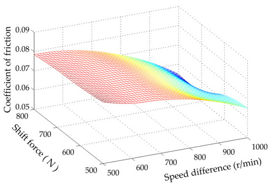 When the speed difference and shift force of the synchronizer were constant, the friction test between the synchronization ring and target gear ring was carried out. The controller collected state variables. In the same step, friction tests were carried out under different working conditions. The data was analyzed as typical when the synchronization time was 0.5 s under different working conditions. The operating conditions of the actual synchronization process were arbitrary, but the operating points of the MAP obtained by collecting data were limited and discrete, so the bicubic interpolation optimization method was needed to obtain the parameter values between the known operating conditions and the temperature and friction coefficient in the whole working condition could be obtained by the parameter values of finite working conditions [28]. After interpolation optimization, the friction coefficient MAP of 0.5 s synchronization time under different working conditions was obtained, as shown in Figure 6.