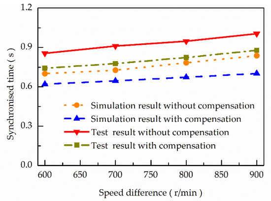 According to the literature and the performance of the synchronization loop, the expected friction coefficient of the synchronization process was set to be 0.08, and the moment of inertia of the synchronized part was 0.04 Kg·m2. The compensation control simulation and test were carried out under different initial shift speeds of the shift. The results of the simulation and test synchronization time with or without compensation were obtained, as shown in Figure 9. When the initial rotational speed difference of the shift was the same, the synchronization time used before the compensation in the test was longer than the compensation, and the regular was similar under different rotational speed differences. The shift speed difference was 600 r/min, the synchronization time used in the pre-compensation test was 0.86 s, and the synchronization time used after compensation was 0.74 s. The compensation time required after compensation was shortened by 0.12 s. The simulation results match the test results. The shift speed difference was 600 r/min. The synchronization time used for the pre-compensation simulation was 0.70 s. The synchronization time used after compensation was 0.62 s. The compensation time required after compensation was shortened by 0.08 s. It can be concluded that the synchronization time can be significantly shortened by compensating the friction coefficient, to ensure its maintenance near the expected value.