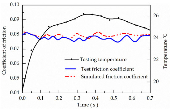 When the initial shift speed difference was 600 r/min, the moment of inertia of the synchronized part was 0.04 Kg·m2. After compensation, the test and simulated friction coefficient results were compared, as shown in Figure 12.