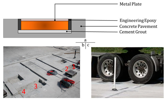 Before installing the P-WIMs, square-shaped pits were cut on the pavement (Figure 4b). Then the bottoms of the pits are leveled parallel to the surface of the pavement using cement grout to have a uniform load distribution on the base of the P-WIMs. As suggested by VDOT, engineering epoxy is used to seal the space in pits and keep the P-WIMs steady in the pavement. A metal plated is placed on top of each P-WIM, and the top surface of the metal plate is precisely aligned to the surface of the lane to avoid any potential impact from passing vehicles. Figure 4a is a sketch of the side view of the installation, and Figure 4c is a picture showing the installed P-WIMs under real traffic.
