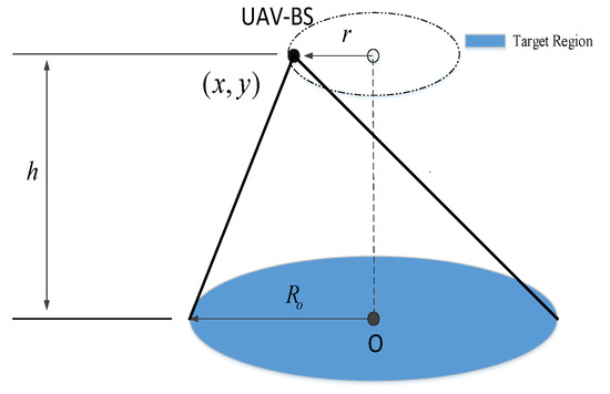 Next, a scenario is discussed such that the UAV-BS at a height of hovers in a circular trajectory with a radius of and the period is . In addition, the instantaneous location of the UAV-BS is assumed to be . The system model is shown in Figure 1.