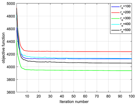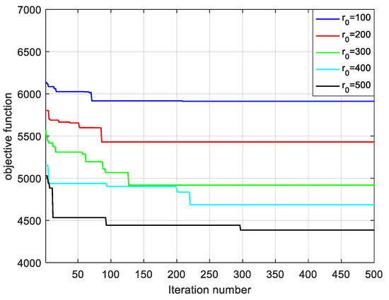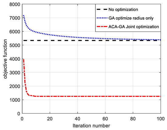 Figure 2 shows the iterative process of the optimal solution when optimizing user scheduling with the ACA. Furthermore, the impact of the different initial radius on the ACA optimization process is shown in the figure. As shown, the initial radius with bigger value will be the smaller value of the objective function optimized by the ACA. This is because the optimal radius was obtained at a certain value in the radius of the target area. The objective function takes the minimum value at the optimal value. Therefore, the initial value with a large difference from the optimal value corresponds to a larger objective function value. Figure 3 shows the iterative process of the optimal solution when optimizing the hovering radius of the UAV with the GA. By comparing Figure 2 and Figure 3, it can be seen that the number of iterations required by the GA to optimize hovering radius of the UAV was less than what was required by the ACA to optimize user scheduling. The problem of optimizing the hovering radius of the UAV is much more complicated than that of optimizing user scheduling, and, therefore, it requires a large number of iterations.