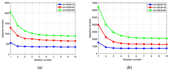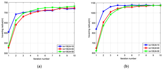 The joint optimization of the hovering radius with a different number of users in the target area is shown in Figure 4 The radius of the target region in Figure 4a,b is 1500 m and 2000 m respectively. As the number of iterations increases, the hovering radius of UAV converges gradually. As shown, the optimal solution of the algorithm generally does not change after the fourth and fifth iterations, which also shows the effectiveness and stability of the algorithm. In addition, a different number of users in the area leads to different results of each iteration. The algorithm eventually converges to a value, which is the optimal hovering radius of the UAV in this scenario.