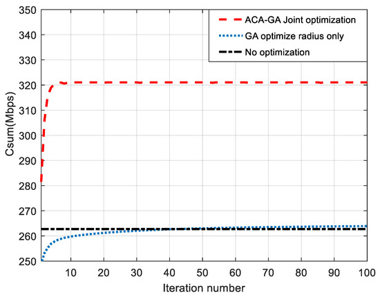 Then we investigate the variation of the throughput with the iteration number in three different optimization methods. We calculate the sum of the transmission rates based on the SNR of the user and user scheduling, to represent the throughput of the network. Therefore, can be written as . is the bandwidth and we assume . As shown in Figure 7, the ACA-GA joint optimization has a significant improvement in the throughput of the network, compared with the case that without optimization and only use GA to optimize radius. ACA-GA converges when the iteration number is 10, while GA converges when the iteration number is about 60. The ACA-GA joint optimization approach has better network capacity and better convergence than either of the above two methods.