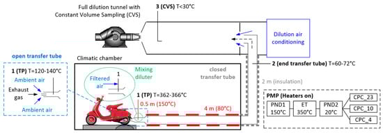 Samples were taken at three locations: (1) close to the tailpipe of the moped; (2) at the end of the transfer tube; and (3) at the dilution tunnel (CVS). The temperatures were also measured at these 3 locations, but they are available in real time only for position (1). Two identical and freshly calibrated measurement systems were used: one (PMP #1) was measuring always from the tailpipe (position 1). The second (PMP #2) was measuring from the CVS (position 3) and for a few tests from the end of the transfer tube (position 2). The systems fulfilled the light-duty vehicles regulations and the PMP specifications [4]. The PMP system of this study (AVL particle counter APC 489, Graz, Austria) [12] consisted of a hot diluter at 150 °C, an evaporation tube at 350 °C, a cold diluter with filtered ambient air at 20 °C, and full-flow butanol-based condensation particle counters (CPCs) with 50% counting efficiency at 23 nm (model 3790 from TSI, MN, Shoreview, MS, USA), 10 nm (model 3772 from TSI, USA) and 4 nm (model 3752 from TSI, USA). The thermal pre-treatment of the PMP systems evaporates volatile and semivolatile particles in order to allow only nonvolatile (solid) particles to be counted [4]. The CPCs optically detect particles that grow in the measurement range of the optics by condensation of butanol [13]. The PMP #1 was connected to the tailpipe with a stainless steel 0.5 m tube heated at 120 °C. This was the default configuration and was repeated in the middle and the end of the measurement campaign (tests 1, 5, 7) (Table 1).