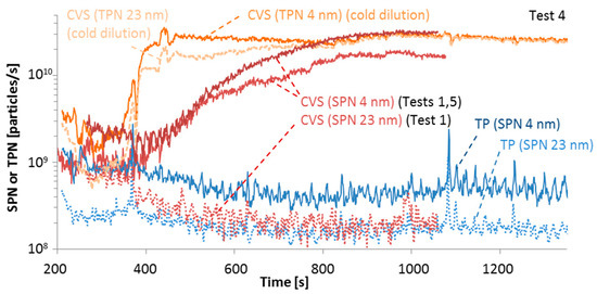 Total particle number (TPN) at the dilution tunnel (CVS) (orange lines, test 4) and solid particle number (SPN) at the tailpipe (TP) (blue lines, test 4) and the CVS (red lines, tests 1 and 5).