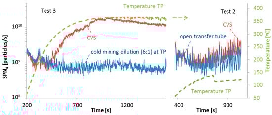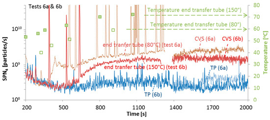Figure 5 plots the SPN emissions at the end of the transfer tube and the dilution tunnel (CVS) and compares them with the tailpipe measurements (Tests 6a and 6b). The first measurement (6a) was with the transfer tube heated to 80 °C and PMP #2 sampling directly from the end of the transfer tube without a 0.5 m heated tube. The second measurement (6b) was conducted with the transfer tube heated at 150 °C and PMP #2 sampling via a 0.5 m tube heated at 120 °C. The spikes indicate water entering the PMP system; this was probably due to condensation at the wrong setup in the first case (PMP system without heated tube). In the second case there were no spikes, except at the beginning where the exhaust gas temperature at the sampling point was still below the dew point (around 53 °C for gasoline vehicles) [15]. Heating the transfer tube to 150 °C increased the final temperature at the end of the transfer tube from around 60 °C to approximately 72 °C (Figure 5, green squares). It delayed slightly the appearance of nonvolatile particles and their concentration was at lower level. However, the lower level could be due to the general decrease of nonvolatile particles concentration over time that was mentioned in Figure 2. When the PMP #2 system was transferred to the CVS (Figure 5, right side) the nonvolatile particle concentrations remained at the same levels, indicating that their complete formation took place in the transfer tube. Interestingly, the nonvolatile particles appeared at exhaust gas temperatures higher than the dew point.