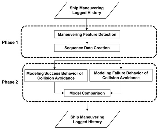 The research framework of this study is presented in Figure 1. In the data processing phase (Phase 1), logged histories were obtained from ship maneuvering simulations. Then, maneuvering features were detected and sequence data were created to model maneuvering behavior. In the model development phase (Phase 2), maneuvering behavior models for the success and failure of collision avoidance were developed through model comparison.