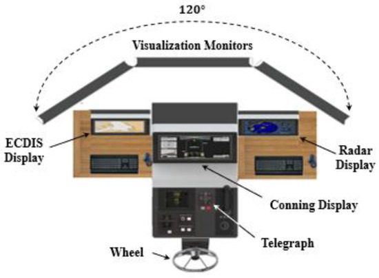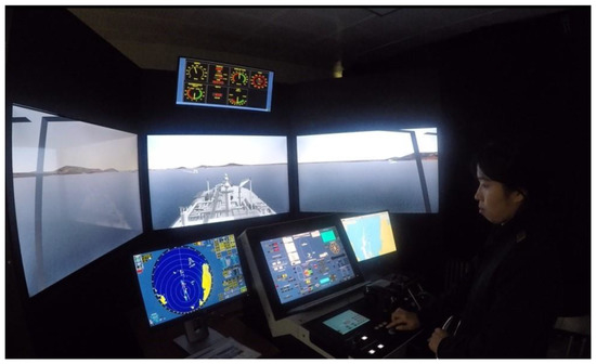 Logged histories were collected in the ship maneuvering simulator using the simulator system manufactured by Kongsberg digital AS (K-sim Polaris ship’s S-bridge simulator) [20]. The Kongsberg simulator is a promising ship-handling training system, which uses maneuvering devices (i.e., steering wheel and engine telegraph), information display of navigation equipment (i.e., electronic chart, information system, and radar), and body-movement calculation software for a ship interacting with a user. Moreover, the Kongsberg simulator provides a human–machine interaction logging system between a user and a ship’s body movement. The logged data can be acquired in the form of an Excel file containing ship maneuvering histories as a time series with two-second intervals. The experimental configuration with the Kongsberg simulator is illustrated in Figure 2. Figure 3 shows a simulation scene by a participant in the simulation scenarios, where collision avoidance action was required, as illustrated in Figure 4. In the simulation, two ships were used, i.e., a Tanker ship (length of 226 m) as the own ship (OS) and a passenger ship (length of 260.8 m) as the target ship (TS). Table 1 shows the specifications and initial conditions of ships used in the simulations.