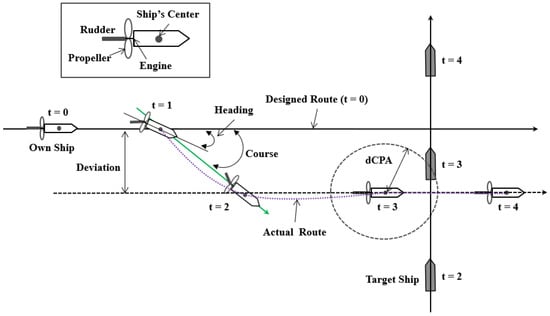 where is the coordinate set of the position of the OS at time t; is the coordinate set of the estimated position of the designed route, which was calculated with the course and speed of the OS at time t = 0.