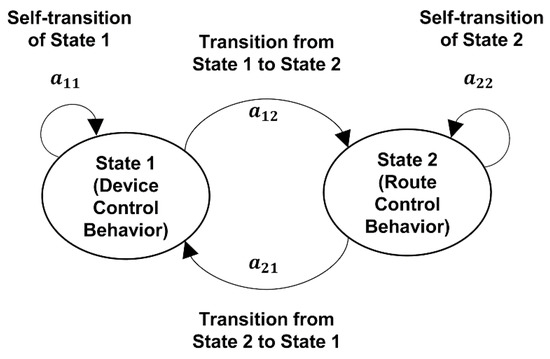 During the model development phase, the rules of the Markov chain and its related methods were used [36,37,38,39,40,41,42,43]. The developed behavior model with two states and three parameters A, B, and π is as follows: