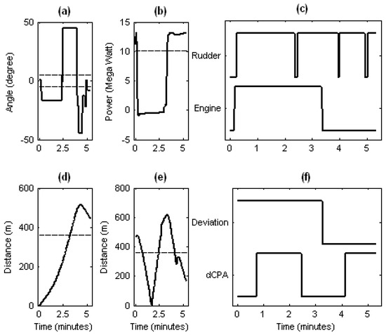 Examples of behavior feature detection of a participant who failed to avoid a collision: (a) rudder angle; (b) engine power; (c) feature detection results for (a,b); (d) controlled deviation; (e) controlled dCPA; and (f) feature detection results for (d,e).