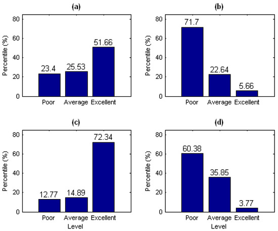 Percentile (%) of behavior performance levels for successful and failed collision avoidance; (a) device control behavior for success; (b) device control behavior for failure; (c) route control behavior for success; and (d) route control behavior for failure.