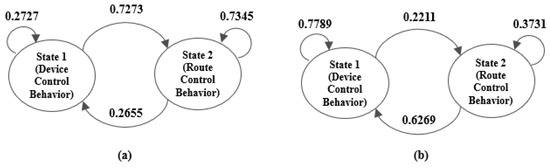 Figure 6 shows a graphical representation of the two-state ergodic hidden Markov model (HMM) used in the behavior model development. Two types of behavior models were developed in this study, the success model and the failure model , which were trained by the sequence data observed from the success and the failure of collision avoidance, respectively. The developed behavior models were validated using model distance and model performance. Model distance evaluates the dissimilarity between two models [43], while model performance measures the correct answering percentile (%) for observations generated by the model. The model distances ( or ) between and were calculated as