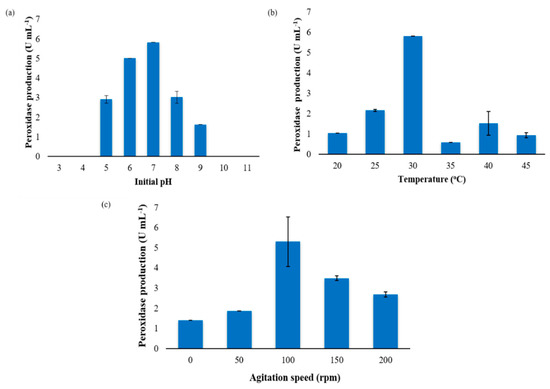 Nutrient accessibility by microorganisms is influenced by agitation, which improves aeration and enhances appropriate mixing of nutrients during fermentation [41]. The influence of agitation rate on exoperoxidase production by Ensifer adhaerens NWODO-2 as presented in Figure 1c revealed that peroxidase production under static condition and across all the studied agitation speeds (50–200 rpm) differ significantly (F = 7.760, p value = 0.0226 for ANOVA), with the optimal production recorded at 100 rpm (5.31 ± 1.23 U mL−1). Nevertheless, the difference between peroxidase production at 150 rpm (3.50 ± 0.12 U mL−1) and 200 rpm (2.69 ± 0.12 U mL−1) was not significant (Tukey’s test). This finding shows that peroxidase production by Ensifer adhaerens NWODO-2 was affected by agitation as there was a significant increase in peroxidase production at 100 rpm (5.31 ± 1.23 U mL−1) when compared with static condition (1.4 ± 0.00 U mL−1). This result is in agreement with previous similar studies, where agitation affected the level of enzyme production [22,42,43]. In this study, 100 rpm was the most favourable agitation speed for peroxidase secretion by the test organism but Patil [43] reported 180 rpm as the agitation rate that supported optimal lignin peroxidase production by Bacillus megaterium. The decrease in peroxidase production observed at 150 and 200 rpm in this study may be as a result of foaming or shearing stress on the mycelium.
