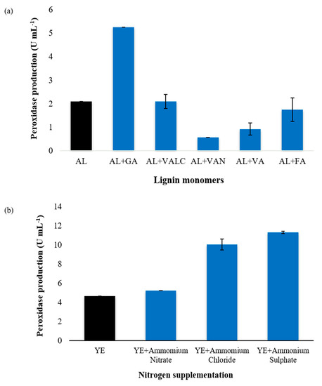 Furthermore, the impact of lignin monomers on exoproduction of peroxidase was assessed by growing Ensifer adhaerens NWODO-2 in an alkali lignin fermentation medium augmented with 1 mM of various lignin monomers: guaiacol, veratryl alcohol, vanillin, vanillic acid and ferulic acid [12] using the following optimal parameters for the enzyme production: temperature (30 °C), initial pH (7) and agitation speed (100 rpm). The alkali lignin medium without supplementation was used as control. Subsequently, the test bacteria was grown in the production medium, wherein the nitrogen source was augmented with varied inorganic nitrogen (ammonium nitrate, ammonium chloride and ammonium sulphate) at the predetermined optimal conditions for exoperoxidase production (30 °C, pH 7, 100 rpm). In this case, the medium not supplemented with inorganic nitrogen (yeast extract only) served as the control. All the experiments were done in three replicates.