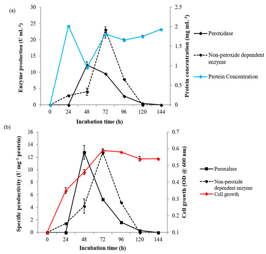 The Ensifer strain was evaluated for extracellular enzyme production with and without hydrogen peroxide for 144 h and the findings are shown in Figure 3. The findings showed that Ensifer adhaerens NWODO-2 attained optimum peroxidase production (12.19 ± 1.05 U mL−1) at 48 h, corresponding to the late logarithmic growth phase with specific productivity of 12.76 ± 1.09 U mg−1 (Figure 3a,b). However, there was a decline in exoperoxidase production as from 72 h, which corresponds to the early stationary phase. More so, exoenzyme activity (23.10 ± 0.82 U mL−1) was detected without the use of hydrogen peroxide and was optimal at 72 h, with specific productivity of 12.76 ± 0.45 U mg−1 protein (Figure 3a,b). The production of peroxidase by Ensifer adhaerens NWODO-2 is growth-associated as the enzyme activity increased significantly at the logarithmic phase with optimum productivity attained at 48 h (Figure 3). The sharp decrease in peroxidase production at 72 h may probably be associated with nutrient depletion or proteolytic activities [22,55]. This finding is contradictory to previous related reports, where optimal production of peroxidase by other bacteria species was achieved at 72 h of incubation [23,35,36]. This discrepancy may be a result of bacterial growth rate, culture medium and inoculum size. The detection of an extracellular enzyme activity without the use of hydrogen peroxide, the typical peroxidase activator, is noteworthy as this may suggest probable laccase production by Ensifer adhaerens NWODO-2 [25].