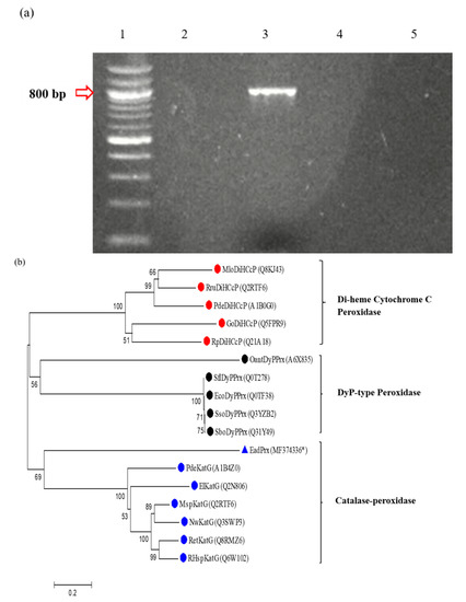 Molecular optimization and genetic engineering seem to be the best option for increased enzyme production. Hence, the imperativeness of detecting the gene responsible for the expression of the enzyme of interest in an organism. Figure 4a shows the gel picture of the PCR amplified product from Ensifer adhaeren NWODO-2. The results showed the band size of the amplified gene as 800 bp. The search of the nucleotide sequence in the UniProt Knowledgebase using blastx program showed 70.5% similarity to Ensifer adhaerens uncharacterized protein (ANK75658). However, phylogenetic analysis of the expressed protein sequence and selected bacterial heme peroxidases in the PeroxiBase database (peroxibase.toulouse.inra.fr) showed that it clustered with catalase-peroxidases (Figure 4b). This finding suggests that the amplified gene from Ensifer adhaerens NWODO-2 may encode a novel catalase-peroxidase with an estimated molecular weight of approximately 31 kDa and isoelectric point of about 11. Bacterial catalase-peroxidases (KatG) belong to class I peroxidases of the peroxidase-catalase superfamily of heme-peroxidases [66]. Other members of class I peroxidases include yeast cytochrome c peroxidases and ascorbate peroxidases.