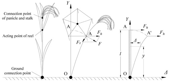 Rice is the staple crop and plays an important role in China’s agricultural production. According to statistical data of 2016, released by the Editorial Board of the Year Book of Agricultural Mechanization in China, China’s rice yield reached 207,075.1 kt, the sown area 30,178.24 khm2, and the mechanized harvesting rate was 87.11%. At present, many colleges, universities, and research institutions around the world focus on the intellectualization of rice harvesters; that is, achievement of automatic sensing and adjustment, and the adaptive control of different components on harvesters by utilizing different kinds of sensors. However, little work about the interaction between rice plant and harvesters has been done [1,2,3,4,5,6]. The deflection deformation of the rice plant, caused by reel, is important to determine a reasonable cutting height. For example, it is usually adopted by harvester operators to lift the header to a higher position during regular rice harvesting, to lower energy consumption in the processes of cutting, threshing, and cleaning. It is also required to harvest the main season of ratoon rice at a specific height to ensure the yield of ratoon season. In short, a proper cutting position could optimize the power configuration of harvesters and satisfy the requirement of special crop. As no accurate calculation methods exist for rice stalk deformation, the cutting height is simply decided empirically by operators. Thus, a simple and efficient calculation method of the deflection is needed.