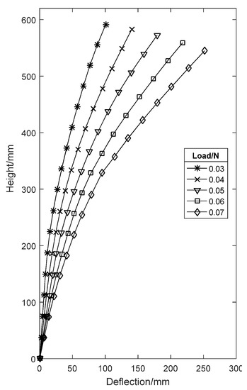 The deflection curves of the stalk with the ear, leaves, and extra stalk removed, which was separately loaded with 0.03, 0.04, 0.05, 0.06, and 0.07 N, are shown in the Figure 4. It was clear that higher the load, the larger the deflection. A one-way analysis of variance (ANOVA) test was conducted, the result indicating that load was significantly related to deflection (p < 0.05).
