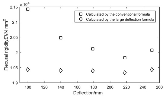 The deflection values of the stalk, corresponding to the deflection of point A, were then used to calculate EI by substituting them into Equations (2), (14), and (15). The results were shown in Figure 5. It was obvious that the EI values were basically consistent by using Equations (14) and (15). A one-way ANOVA test was also conducted, the result indicating that differing deflection had no significant influence on flexural rigidity (p < 0.05), while the values of Equation (2) differed widely when the deflection increased. The experiment validated the appropriateness of Simpson’s formula for the calculation the flexural rigidity. On the other hand, the maximum deflection value measured in this paper exceeded the common deflection range of 100–200 mm, which means this method could meet the requirement of flexural rigidity calculation in rice harvesting.