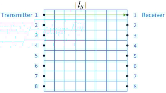 where is the length of the ith propagation path in the jth grid, as shown in Figure 1, represents the slowness in the jth grid. For grids and propagation paths, Equation (3) can be rewritten as the following linear equation: