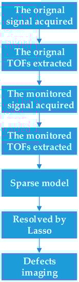 The flow of our method is shown in Figure 3. The received signals in the plate-like material without defects are recorded and their TOFs are extracted as the original TOFs. Then, the plate-like material is defected and the received signals in this plate-like material with defects are recorded and their TOFs are extracted as the inspected TOFs. Our sparse model is used, and the defects can be imaged by Equation (12).