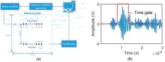 Our experimental system consisted of a computer, an arbitrary waveform generator, a power amplifier, an oscilloscope and ultrasound transducers. Its schematic diagram is shown in Figure 4a. Piezoelectric transducers (PZTs) were employed as the ultrasound transducers in our SHM system, where the diameter of each PZT was 5 mm. The central frequency of the transducer was 250 KHz. There were 20 transducers in the transmitting and receiving arrays respectively, which were attached to a monitored aluminum plate with the dimension of 500 mm × 500 mm × 1.5 mm. The transducer spacing was 10 mm for both the transmitting and receiving arrays. The distance between the two arrays was 200 mm. Therefore, the monitored area was 200 × 200 mm2. The monitored area was divided into different numbers of grids.