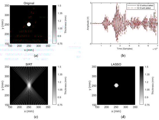 Certainly, based on our sparse model, both the SIRT and the regularization methods can be used to do defect imaging. Compared to the other regulation methods, the LASSO method has two main advantages as given in Reference [35]. First, it can achieve good estimation and prediction by shrinking the estimator towards 0. It means that the sparse solution of the sparse model can be obtained by the LASSO method but the other regularization methods for the lp-norm with p > 1 cannot. For p < 1, their solutions are sparse but the problem is not convex and this makes the minimization very challenging computationally [36]. When the solution is not sparse, it means that many of the solutions, (i = 1,2, …, N2), are not 0. It also implies that the visible artifacts are generated. Second, there is a simple iteration way available for LASSO to converge fast, which make it very attractive computationally in terms of central processing unit and memory.