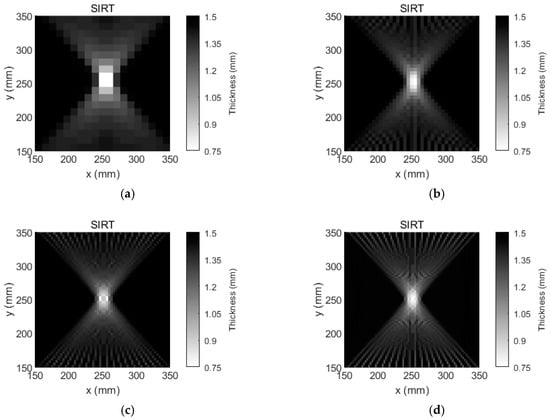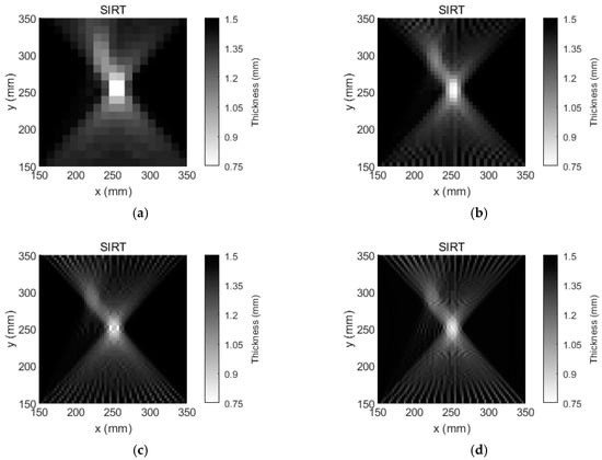 Tomographic reconstruction images for a 1.5 mm thick aluminum plate with a 20 mm diameter circular flat-bottomed hole with different grid density using the SIRT. The thickness loss was 50% within the flaw. (a) The number of grids was 20 × 20, (b) the number of grids was 40 × 40, (c) the number of grids was 60 × 60, and (d) the number of grids was 80 × 80.