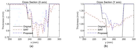 The cross sections of Figure 11a with the corrosion depths are shown in Figure 12a,b. It can be seen that the depth estimation results of our method were better than SIRT in most cases, especially along the vertical line marked in Figure 11a. However, the depth estimation results of the thinnest thickness were worse than SIRT.
