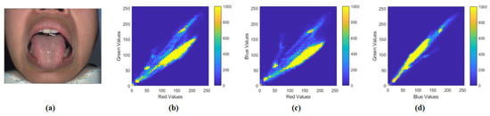 After a raw image showing the lower half of an individual’s face with their tongue protruding is captured in the first step. The next step takes the captured image and converts it to a grey-scale image after selecting one channel of the raw image to enhance the tongue domain [13]. The dominant color analysis of one sample in the dataset is shown in Figure 3. In Figure 3, (a) is a sample selected from the tongue image dataset, (b), (c) and (d) are the bivariate histograms to describe the different RGB values coming from the channels of each pixel. The RGB model is a color model which takes red, blue and green as the primary colors. In the histograms of Figure 3b–d, the color ranges from deep blue to yellow representing the frequency of pixels in the image. The color bar beside each histogram displays the relationship between the colors and the pixel frequencies. As can be seen from the yellow regions (high-frequency regions) of Figure 3b,c, most pixels have a higher red channel value with a lower blue and green channel value. Meanwhile, (d) shows that the majority of pixels (in the yellow region) have almost the same number of blue and green values. In the end, this indicates that the red color is the dominant color of tongue images. Therefore, for all samples, the red channel is selected since it is the dominant color. Next, the third step is mask prediction. In this step, a grey-scale image from the previous step is fed into the segmentation model. Afterwards, the model will output a well-refined mask image, only containing binary information to indicate which pixels belong to the tongue. Followed by this, the fourth step is tongue image extraction. In this step, the completed tongue image is extracted from the original raw image according to the mask image. The extracted result is regarded as the final output of the system.