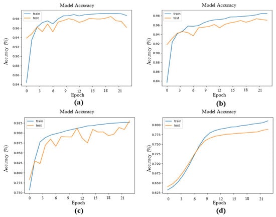 Accuracy on the training and test sets using different learning rates (). (a) accuracy with ; (b) accuracy with ; (c) accuracy with ; (d) accuracy with .