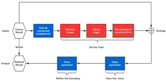 The pipeline of the morphological processing layer. The input (Coarse Result) is a binary image which is generated from U-net. First, all connected components of the Coarse Result are computed. Then, all ‘hole’ filling procedures (Reverse image, Obtain edges, Morphological reconstruction) are performed. Next, overlap the Coarse Result with the result of ‘hole’ filling. After that, the Open operation is performed to clear noise. In the next step, the Close operation is performed to refine the boundary of the result. Finally, the Refined Result is the output.
