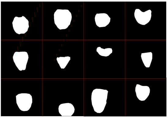 There are two steps in the training preparation. First, the dataset is split into two parts: a training set and a test set. The number of images in the training set and test set is 800, while the number of images in the test set is 200. Afterwards, each mask of the training set is generated manually using the labelme [29] annotation tool and then converted into a 576 × 768 bitmap file with two bits of bit depth. The mask image is a binary image, whose pixels in the foreground are 255 (white), while the pixels in the background are 0 (black). An overview of the information of the mask set is summarized in Table 3. The mask images corresponding to the samples in Figure 8 are shown in Figure 9. In Figure 9, the region in white is the foreground (255), which covers the area of the tongue and draws the contours precisely. The region in black is the background (0).