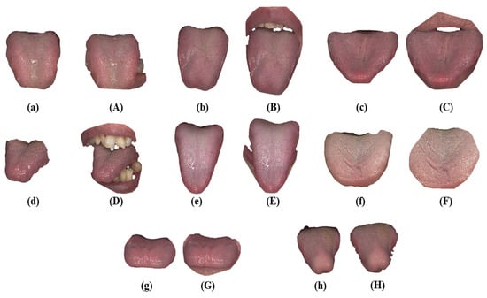 The tongue image dataset contains 1000 samples captured by a device described in [8]. The images were stored in Bitmap (BMP) format and divided into various classes of diseases. Each image has RGB channels in the depth of 24 bits. The resolution of each image is . Some samples of the tongue image are displayed in Figure 8. An overview of the dataset is summarized in Table 2. For the background of each image (in Figure 8), there are a variety of non-tongue artifacts: chin rest of the capture device, cheeks, nose, lips, along with various teeth. For the foreground of each image, the tongues are presented in different positions and poses, textures, shapes, and colors. More information on the dataset can be found in [10].