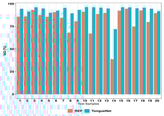 The IOU results of TongueNet and REF are displayed in Figure 12. The proposed TongueNet achieved an IOU of over 90% on almost all samples with the highest value reaching 96.38% (the 10th sample). This indicates that most of the pixels in the tongue region were predicted precisely. Furthermore, TongueNet outperforms REF on all samples with the most significant difference being 33.7% (the 14th sample). To present an overall perspective of IOU, the mean IOU (MIOU) is 93.11% for TongueNet, while the MIOU of the REF method is 83.1%. In general, more pixels in the tongue region will be predicted correctly by TongueNet than REF.