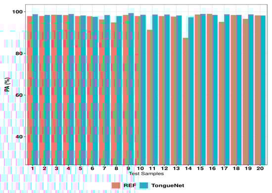 The PA comparison of TongueNet and REF on 20 test images is illustrated in Figure 13. The proposed TongueNet obtained over 97% for all test samples, with the highest being 99.33% (the 9th sample). This means TongueNet can correctly predict on average over 97% of the pixels from the images in the test set, indicating that TongueNet holds a high prediction accuracy. Similar to the IOU results (above), TongueNet also outperformed REF on all test samples, where the mean PA (MPA) of TongueNet is 98.44%, while the MPA of REF is 96.8%. Thus, it proves that TongueNet has a stronger ability at pixel prediction.