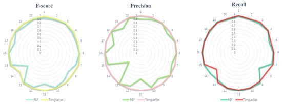 The F-score (left), Precision (middle), and Recall (right) between the proposed method and REF for 20 test images are shown in Figure 14. From the radar charts in this figure, it can be observed that TongueNet outperforms REF in Precision and Recall on almost all 20 test samples. This reflects the high reliability as well as the comprehensiveness of tongue region prediction using the proposed method. Although some Recall values of TongueNet in Figure 14 (right) are lower than REF (the 11th sample and the 14th sample), the F-score of each test sample is still higher, indicating the general superiority of TongueNet over REF.