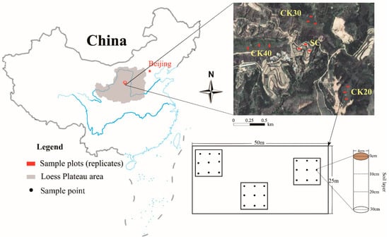 To explore the temporal variation in soil enzymes in the present study, we use the stand age to represent the inter-annual variation, and the different plant growth stages represent the intra-annual variation. Based on the land-use history, three age classes of CK forests were selected in 2013, as well as one slope cropland (SC) with a low level of fertilization. The three age classes selected were CK that has been planted for 20, 30, and 40 years, all converted from cropland subjected to similar farming practices. Detailed information for each age class of CK forest and SC is shown in Table 1. We chose three independent replicate sample lands with size of 25 × 50 m sample lands for each of the three age classes of CK forests and the SC (Figure 1). The three sample lands for each age class were within 1 km of each other to ensure consistent climatic and environmental conditions. Three sample plots (with the size of 10 × 10 m) were selected in each sample land for sampling. All plots were topographically similar (i.e., slope aspect, slope degree) with similar elevation. Thus, a total of 36 sampling plots were established (four land use types × three sample lands × three replicate plots).